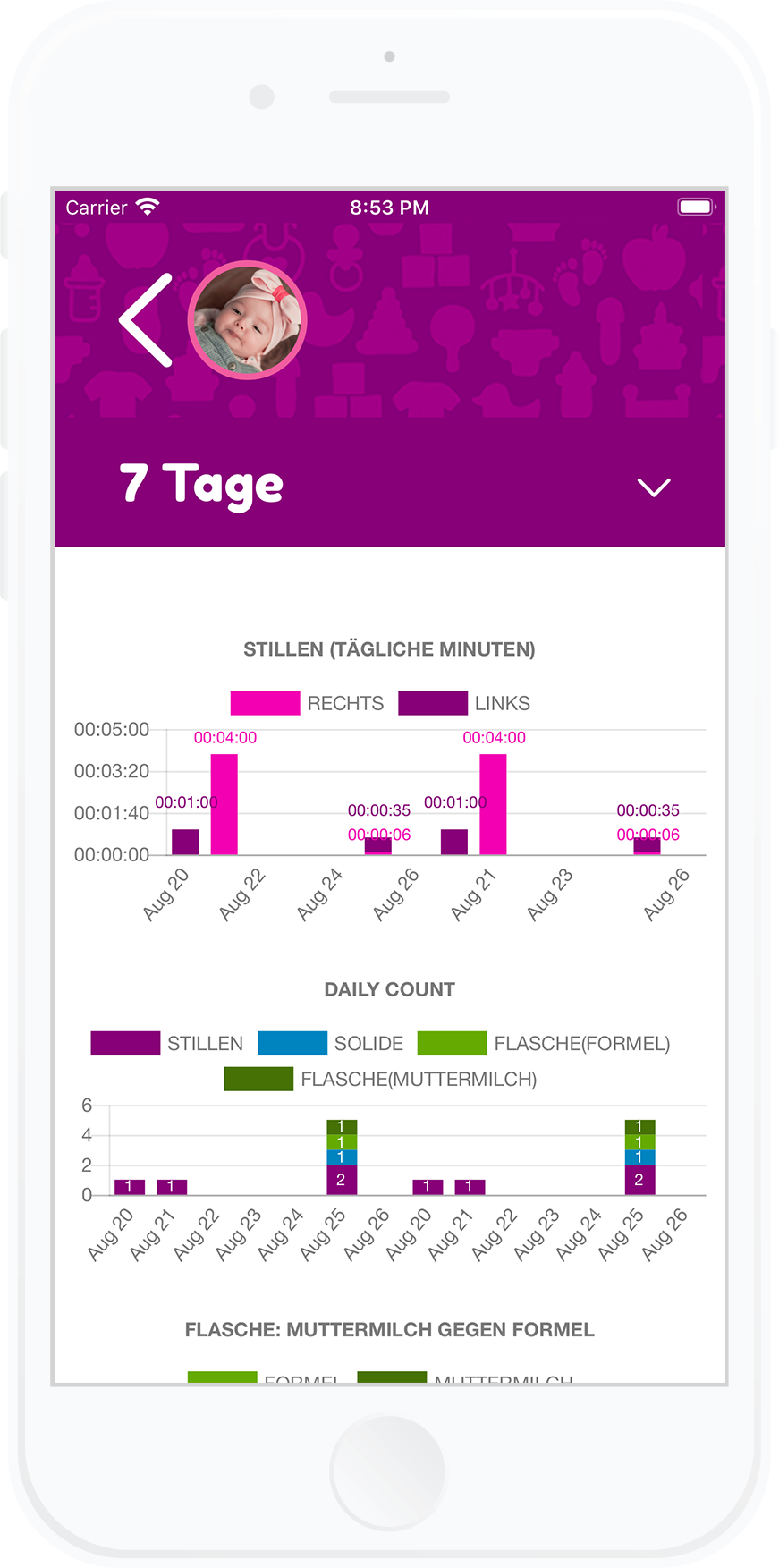 Verfolgen Sie das Stillen, die Flaschenfütterung (Muttermilch oder Formel) und feste Nahrung. Fügen Sie Notizen für Flaschen und feste Nahrung hinzu, um die Reaktion Ihres Babys auf verschiedene Lebensmittel zu erfassen.