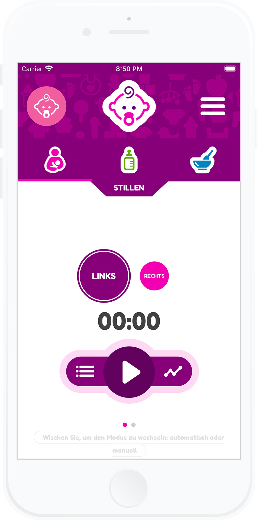 Verfolgen Sie das Stillen, die Flaschenfütterung (Muttermilch oder Formel) und feste Nahrung. Fügen Sie Notizen für Flaschen und feste Nahrung hinzu, um die Reaktion Ihres Babys auf verschiedene Lebensmittel zu erfassen.